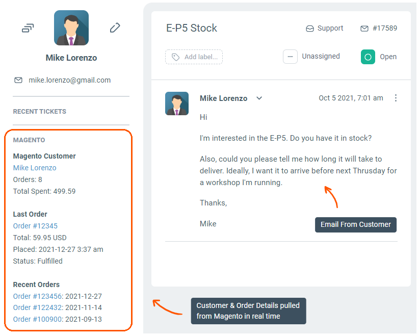 Enchant’s Magento integration allows your team to see customer data, such as recent orders, right beside their conversations in their inbox. With this data, your team can create personalized experiences for your customers and create a better customer experience overall.