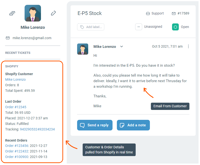 With Shopify integration, Enchant brings all customer data including recent orders from a Shopify store and makes it available right beside each conversation in your inbox.