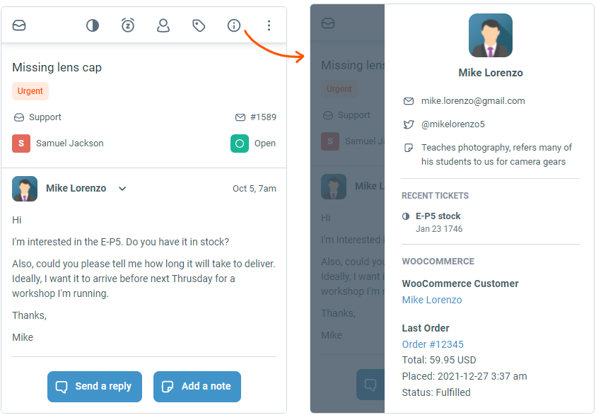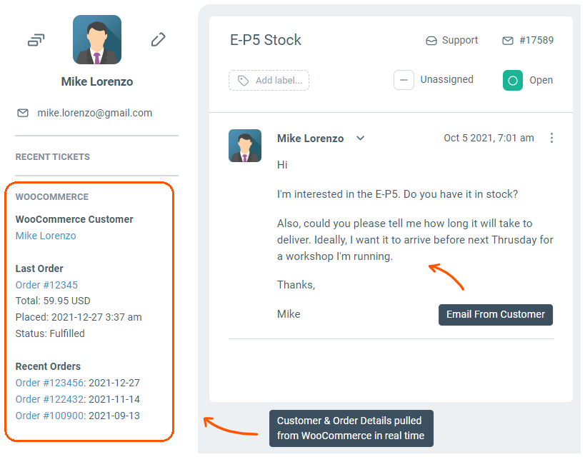 With WooCommerce integration, Enchant brings all customer data including recent orders from a WooCommerce store and makes it available right beside each conversation in your inbox.