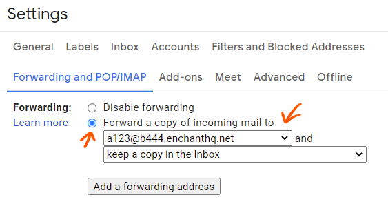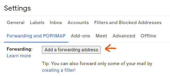 Under the Forwarding heading, click Add a forwarding address.