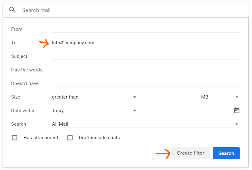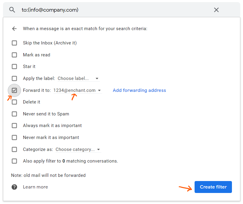 Select the Forward it to action and pick the forwarding address you verified in Step 2. Now, click Create filter.