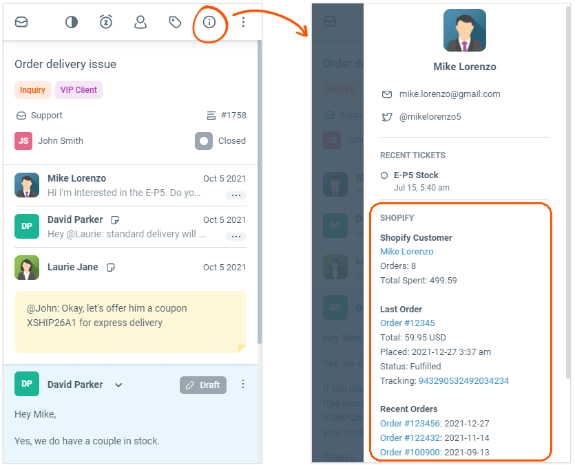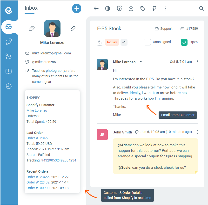 Now the software can bring all the Shopify order details to the shared inbox. It’s super easy for your team to collaborate with each other while answering customer questions. For example they can: