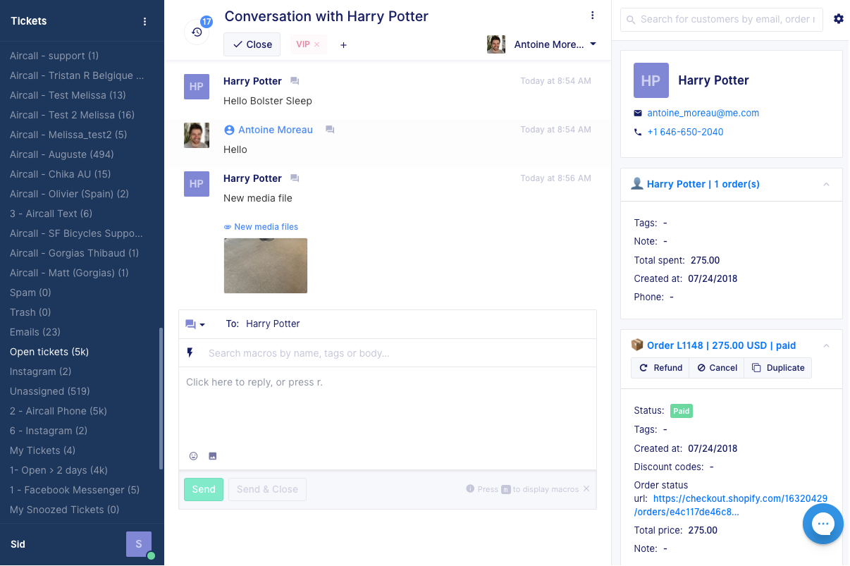 Gorgias is a great customer service tool for businesses that run online retail stores. It offers deep integration with popular ecommerce platforms like Shopify and BigCommerce, making it easy for teams to quickly take care of tasks like refunds and orders.
