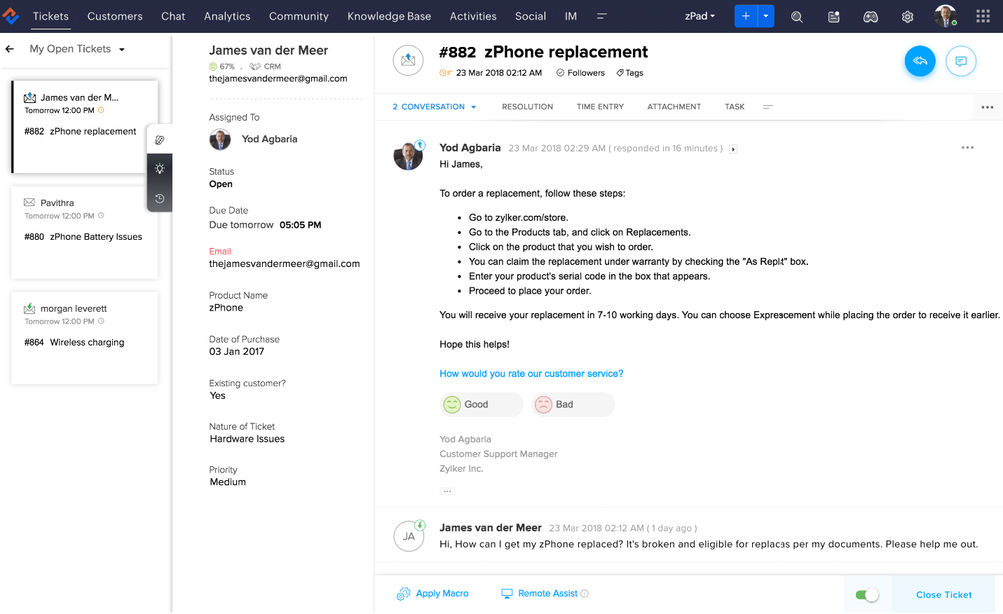 Zoho Desk is a customer service tool that allows you to easily communicate with your customers through popular channels like email, live chat, social media, and phone. It's packed with a ton of features like automation and rules that provide a high level of customization so you can tailor the product to your specific needs.